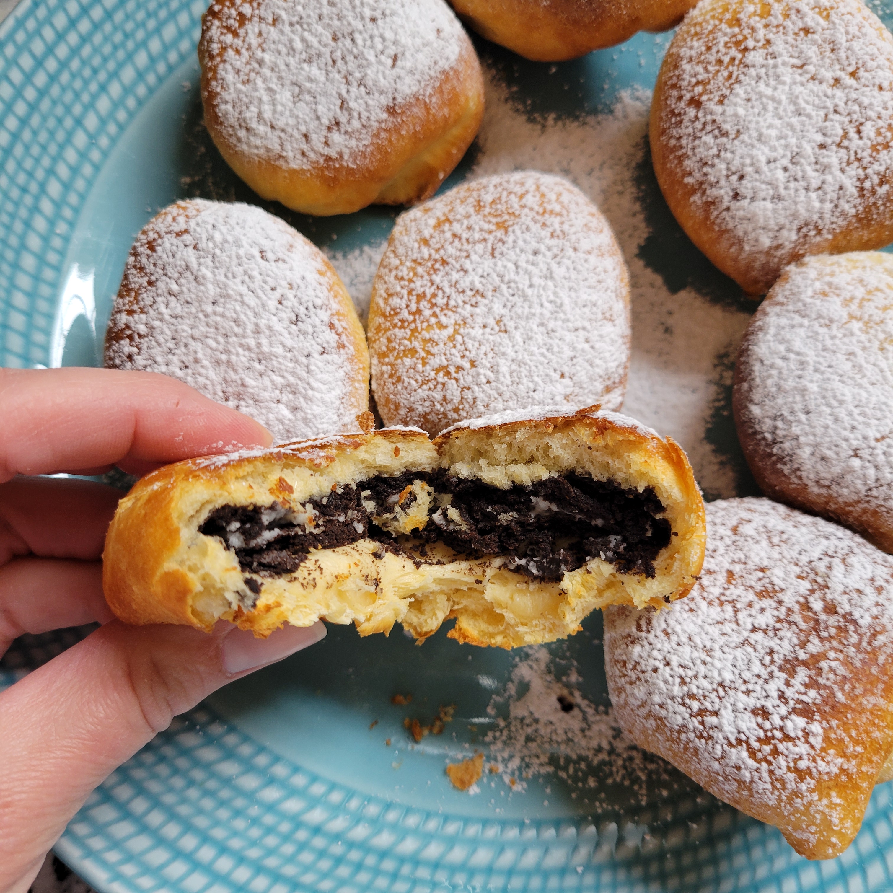 Transfer to a place and immediately dust with powdered sugar. Just like traditionally fried oreos, let them cool for a minute or two before your bite in … otherwise you’re going to burn your mouth.