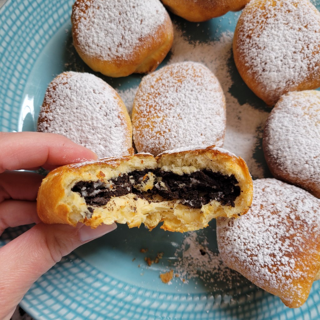 I decided to give the air fried version a try and they were so good. Granted, it’s not the same as being fried in hot oil … but it brings back the nostalgia of working all those early mornings making and eating fried oreos. This recipe uses crescent rolls as the dough. Quick and easy!