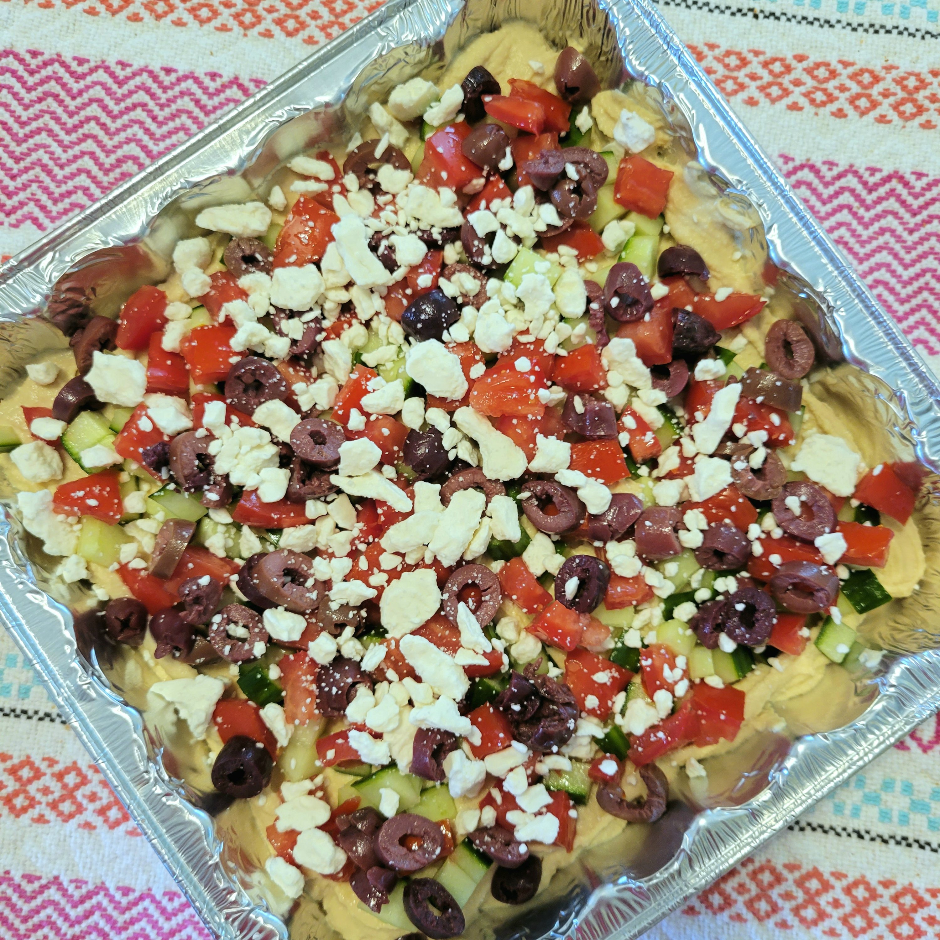 In a 8×8 baking dish or platter, spread the two containers of hummus evenly. Sprinkle the cucumbers, tomatoes, olives and feta over the top. Serve immediately with a bowl of baked pita chips.