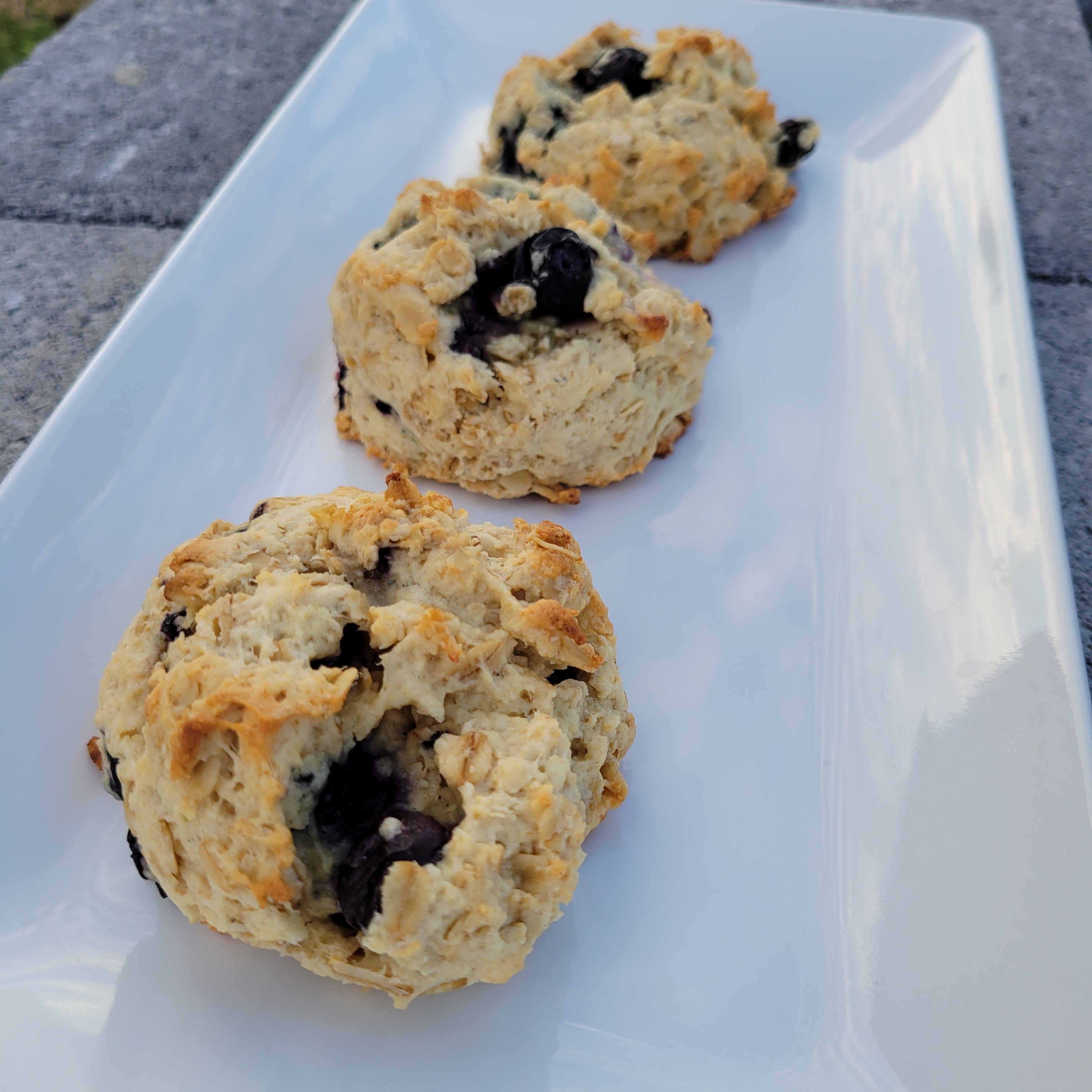 Pour the wet ingredients into the dry and fold in the blueberries. Do not over mix batter. Using an ice cream scoop, drop dough onto the prepared baking sheet. Form into circles. Bake for 15 minutes or until the tops are golden brown.