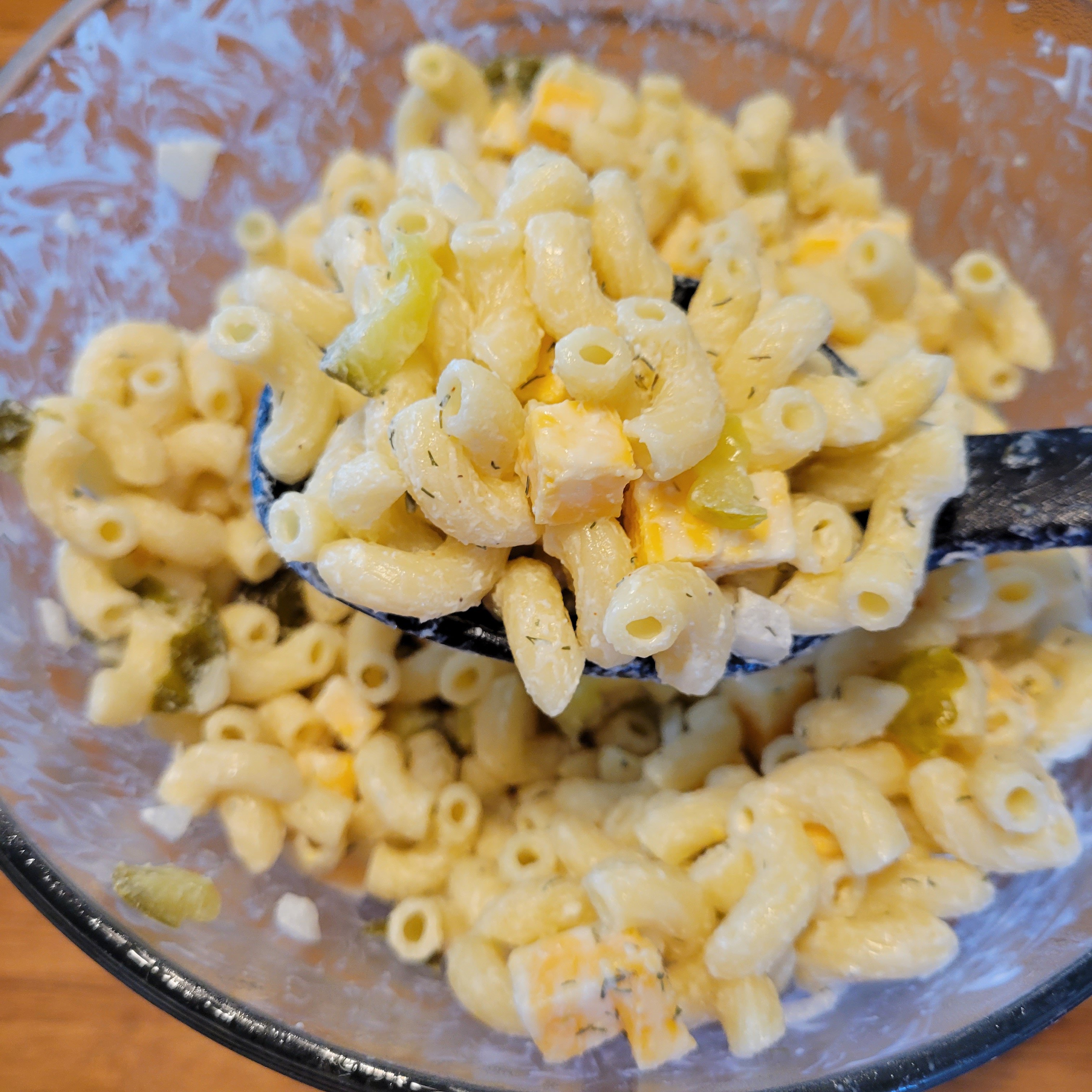In a small bowl, combine the mayo, sour cream, dill, 4 tablespoon pickle juice and season with salt and pepper. Mix well. To the cooked pasta, add in the chopped pickles, cubed cheese and onion. Stir to combine. Pour the dressing over the pasta and stir to thoroughly coat the pasta with the dressing.