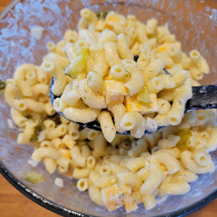 Cook the pasta al dente according to the package instructions. Run under cold water to stop cooking. Toss the pasta with the 1/2 cup of pickle juice and allow to sit for 5 minutes. Drain and discard the juice and then place in a large bowl. Set aside.