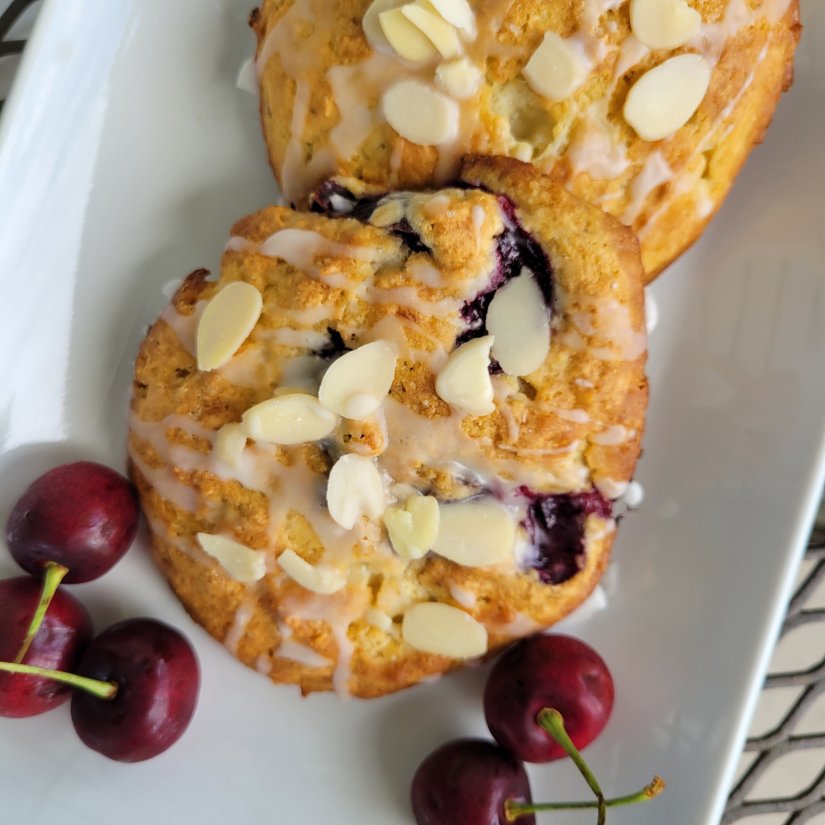 These scones are on the softer side and not like a traditional drier scone. The bits of cherries are perfect in the scone and I loved the addition of the glaze and crunch of the almonds on top. I’ll definitely be making this recipe again!