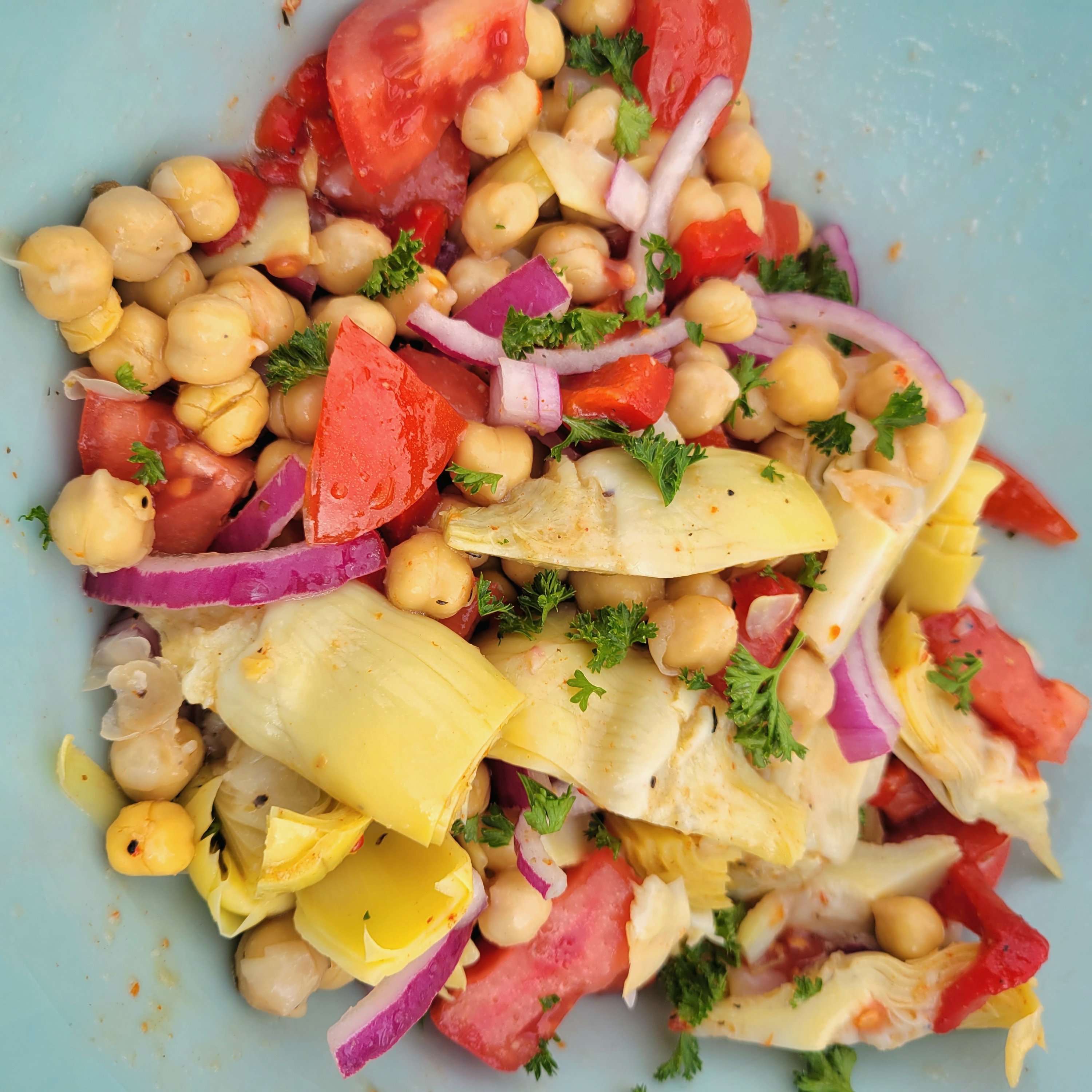 I used things I had in my kitchen – canned artichokes, chickpeas, roasted red pepper, tomatoes and bottle of Italian dressing. You could easily make a homemade vinaigrette, but I had a bottle open and wanted to use it up. I’ll definitely be making it again and adding in cucumber next time.