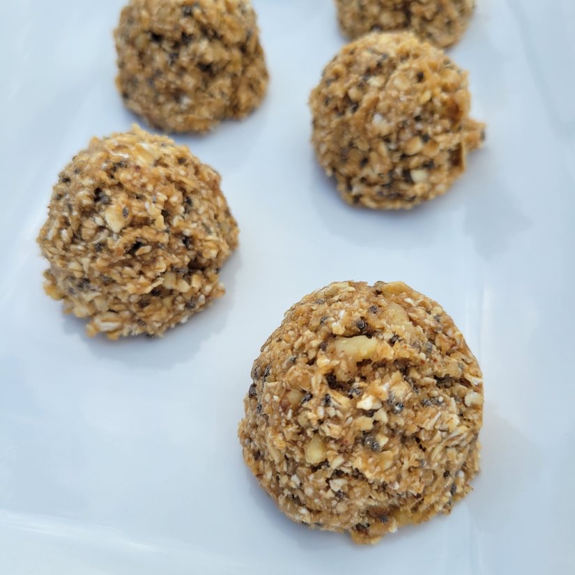 In the bowl of a food processor, add all the ingredients. Pulse until all the ingredients start to come together. Thee should be still some pieces of small walnuts left for texture.