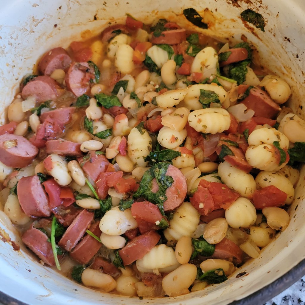 In about 30 minutes, this recipe comes together with smoked sausage, white beans, tomatoes, spinach in a delicious broth.
