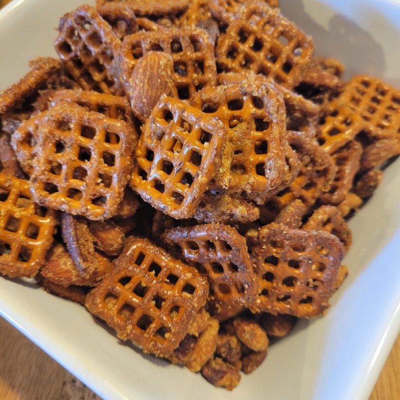I hosted my family for Christmas and we did a variety of appetizers. I wanted something crunchy and spicy and found this recipe for a nut and pretzel mix. I’ve already made two batches and will be making it probably every week for my family. The first batch wasn’t as spicy and only had a little heat. The second batch I was a little more heavy handed with the spice and my daughter really enjoyed this version.