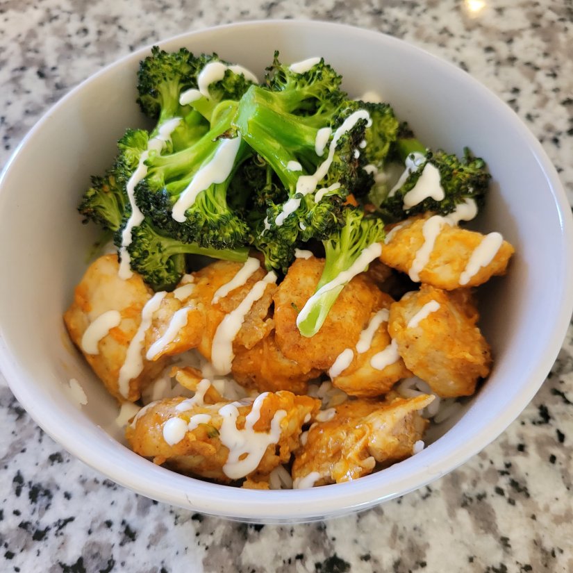 The chicken is lightly breaded and baked, then tossed in buffalo sauce or whatever sauce you prefer. Add in roasted broccoli over a bowl of rice….drizzle with ranch or blue cheese and you have a bowl of deliciousness!