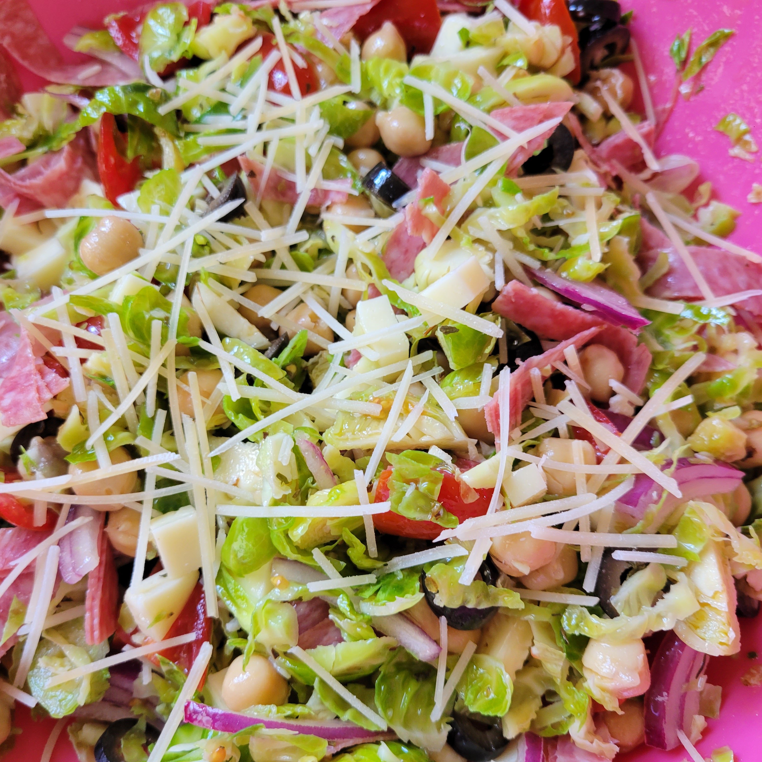 In a large bowl, mix together the Brussels Sprouts, tomatoes, chickpeas, red onion, black olives, salami and provolone cheese. Set aside while you make the dressing. In a mason jar, add all the dressing ingredients. Cover and shake the jar to mix the dressing. Pour over the salad and mix to combine. Sprinkle with Parmesan cheese and serve.