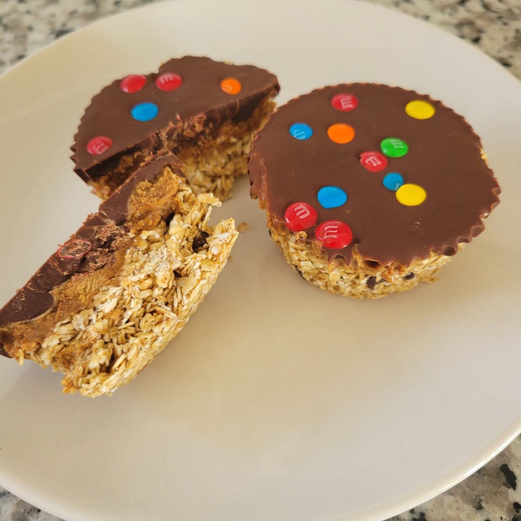 While the cups are in the freezer, melt together the peanut butter and remaining coconut oil. Divide evenly among the cups and top with the mini M&Ms and chocolate chips.