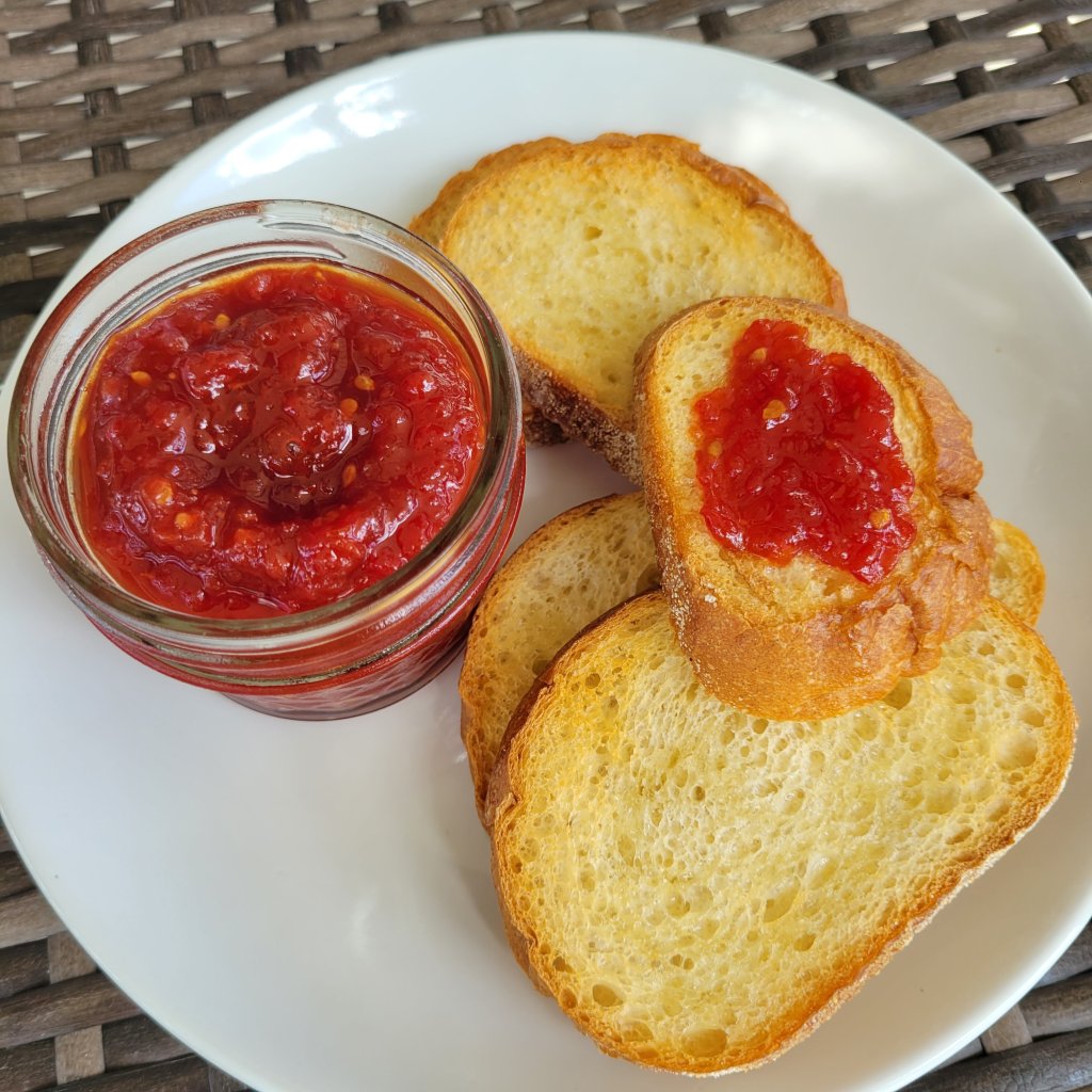 I’ve been wanting to make tomato jam for awhile and now was the perfect time to it. It was super easy to make and it’s delicious! We enjoyed it with toasted crostinis – but I can’t wait to try it on a grilled cheese and burgers.
