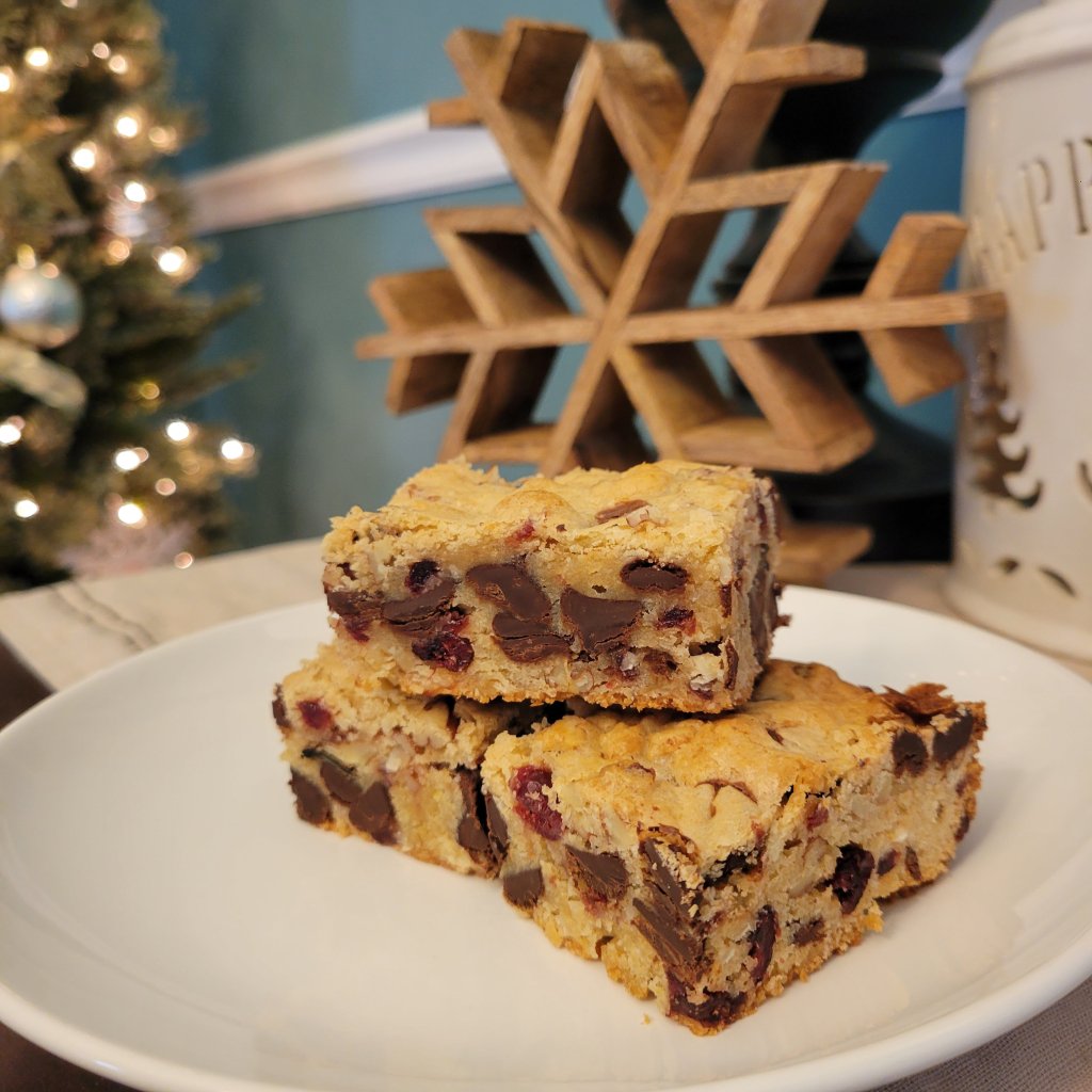 Fold in the chocolate, cranberries, pecans and shredded coconut until evenly distributed. Transfer to the prepared baking pan and spread evenly. Bake for 35 to 40 minutes or until golden brown. Allow to cool in the pan for 15 minutes. Remove from the pan and allow to completely cool before slicing. Store in an airtight container.